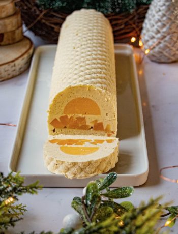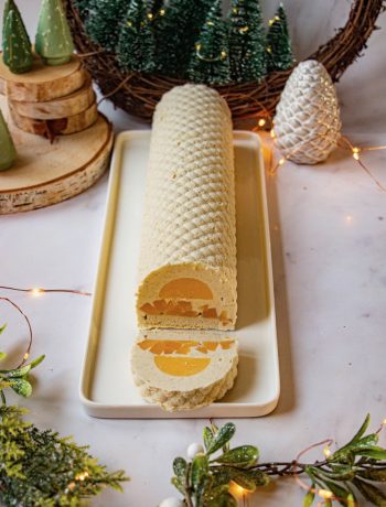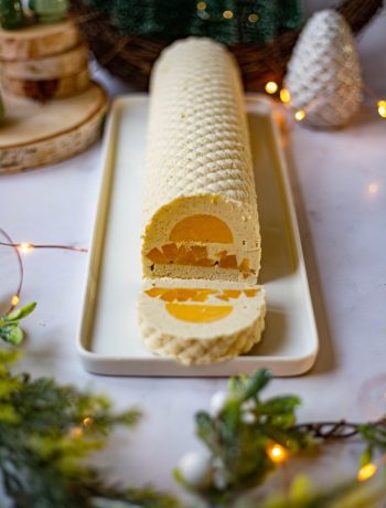 Here is my vanilla, passion fruit, and mango yule log (or entremet)! How about bringing some sunshine and exotic flavors to our table?