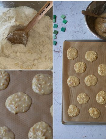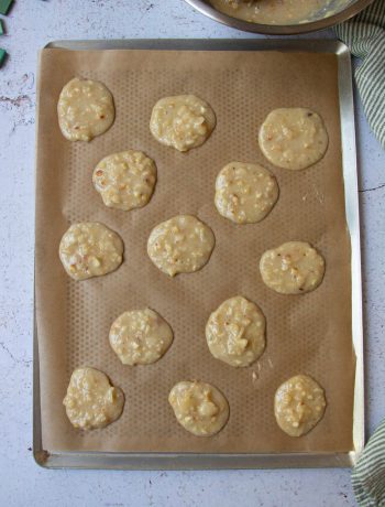 Using a spoon, form small mounds on two baking trays lined with parchment paper, leaving enough space between each. (You can sprinkle some extra sliced almonds on top if you like.)