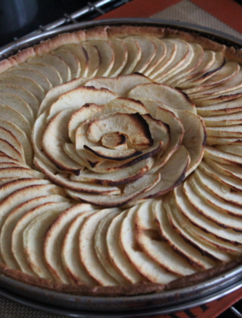 Finally, paying attention to the arrangement of the apple slices will add that extra visual appeal to your Alsatian apple tart. I slice my apples with a Japanese mandoline. And for easy unmolding, I use a 28 cm tart ring for this version.