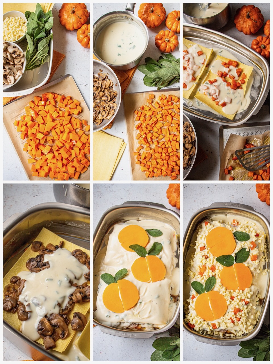 Squash Cut your squash into cubes and place them on a baking sheet lined with parchment paper. Pour the 2 tablespoons of olive oil over them, salt, and pepper. Bake for 30 minutes. Mushrooms Melt the butter in a skillet. Add the peeled and sliced onion, then after 2 minutes, add the peeled and sliced mushrooms. Salt and pepper. Cook for a good 10 minutes. Béchamel sauce Melt the butter over low heat in a saucepan. Add the flour and mix well. Pour in the cold milk, add salt, pepper, and grated nutmeg. Cook over medium heat, whisking continuously until thickened. Finally, add the finely chopped sage. Assembly Preheat your oven to 200 degrees. Butter your baking dish. Pour a ladle of sage béchamel and spread it roughly. Place two lasagna sheets at the bottom of the dish. Add a first layer of squash cubes (half of what you have). Pour a little béchamel. Place two lasagna sheets on top. Add a first layer of mushrooms (half as well). Pour a little béchamel. Place two lasagna sheets on top. Repeat with a second layer of squash and mushrooms. Finish by placing the last two lasagna sheets. Pour the remaining béchamel, spread it. Then add the last sage leaves and sprinkle with cubes of mozzarella. Bake for 25 to 30 minutes.Autumn Lasagna with Squash and Mushrooms