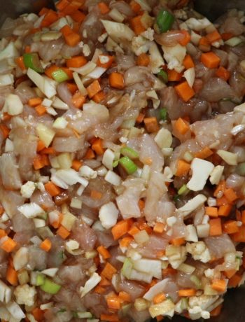 Dough Mix the flour, water and salt in a large bowl. Knead by hand for 5 minutes. Shape a ball, wrap in a cling film and set aside for 30 minutes. Filling Cut the chicken, carrot, cauliflower and scallion in very small cubes. Set aside in a bowl. Grate the ginger and garlic. Add to the bowl. Add the soy sauce, sesame oil, salt and pepper. Set aside. Cut the dough in half and shape each half into a long log, about 1,5 cm diameter. Cut each log into 1,5 cm pieces. Flatten with a rolling pin into a round shape until you get 1 mm thickness. Pour 1 teaspoon filling in the center. Put a bit of water on the boarder with your finger and close your gyoza. Set aside. Start again until you use all the dough and filling. Heat the oil in a frying pan, place the gyoza and cook at medium heat for a few minutes. When the bottom of the gyoza is golden, pour 1/2 glass of water and cover with lid. Cook at low/medium heat until there's no more water (add more water if needed).Chicken Gyoza