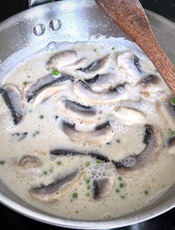 Ajoutez-y les champignons coupés en tranches et les petits pois. Cuisez 5 minutes.