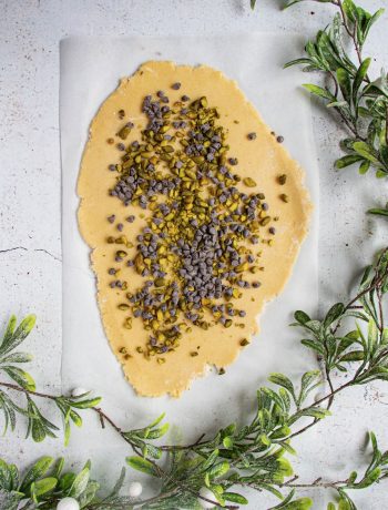 Sprinkle the chocolate chips and the pistachios (roughly chopped with a knife) evenly over the dough.