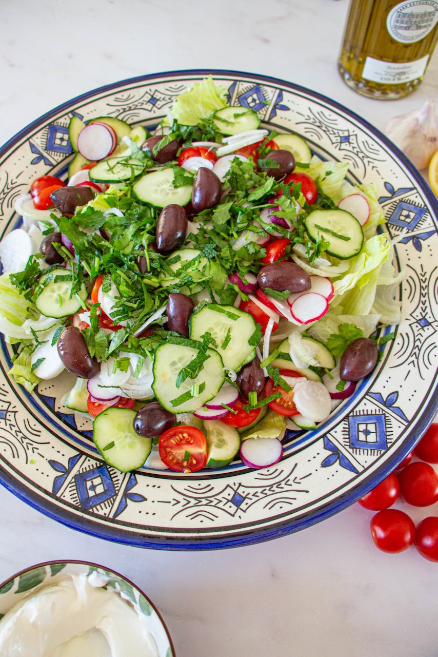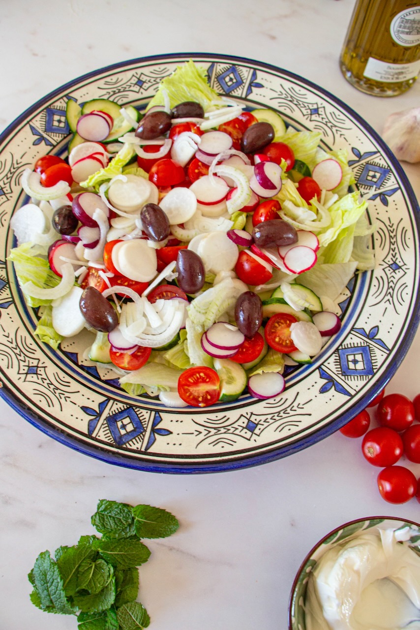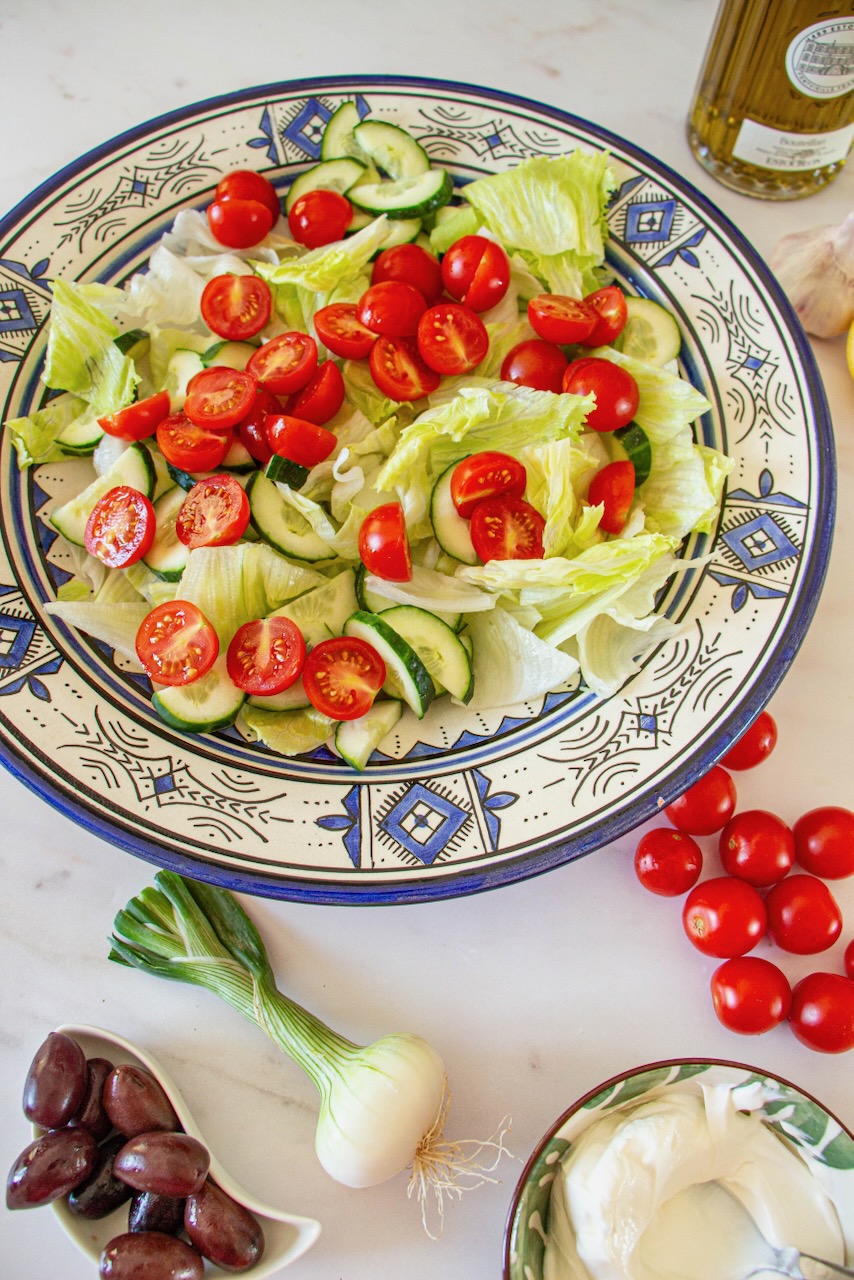 Add the cucumber, radishes, olives, tomatoes, Iceberg lettuce, and chopped spring onions to your liking.
