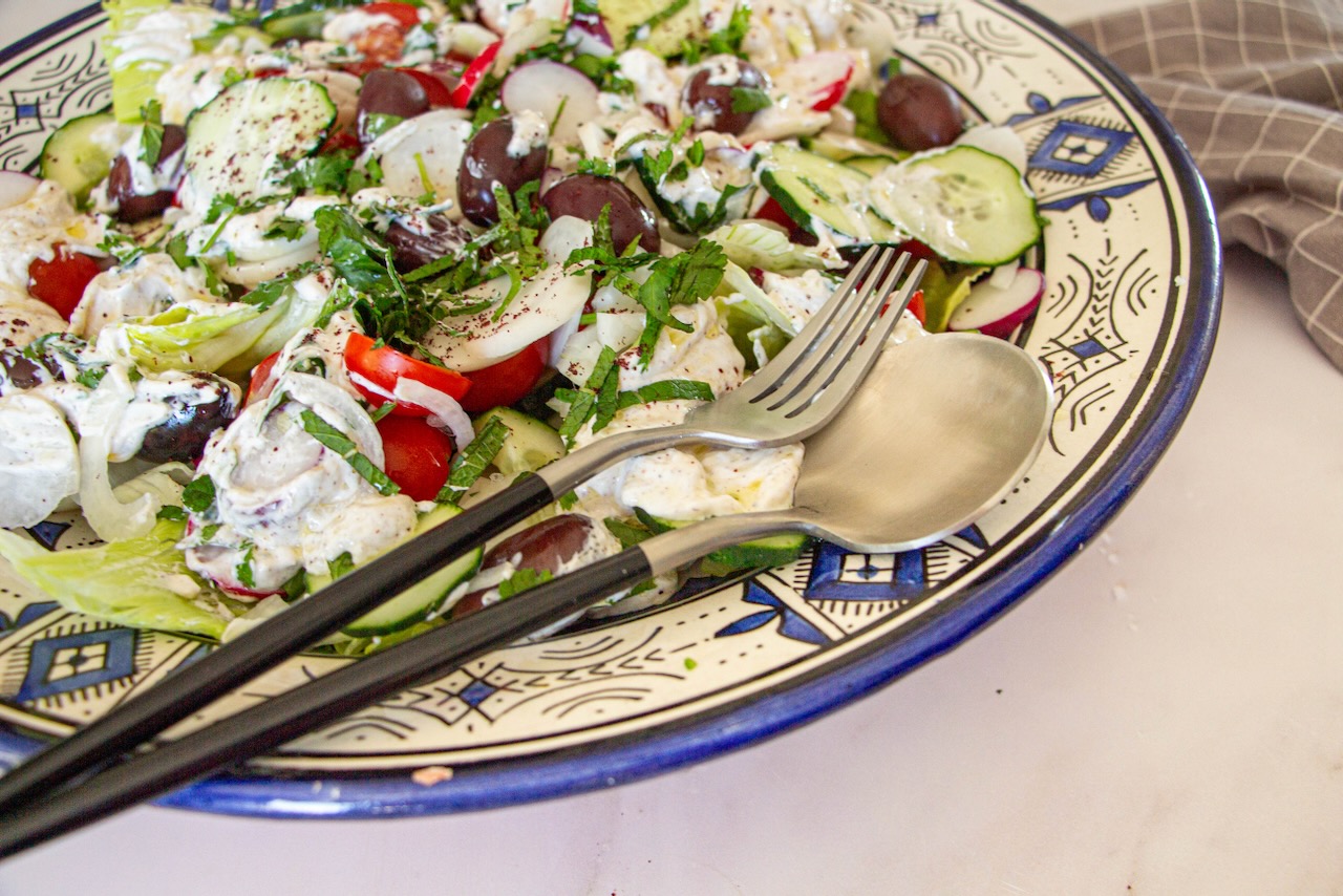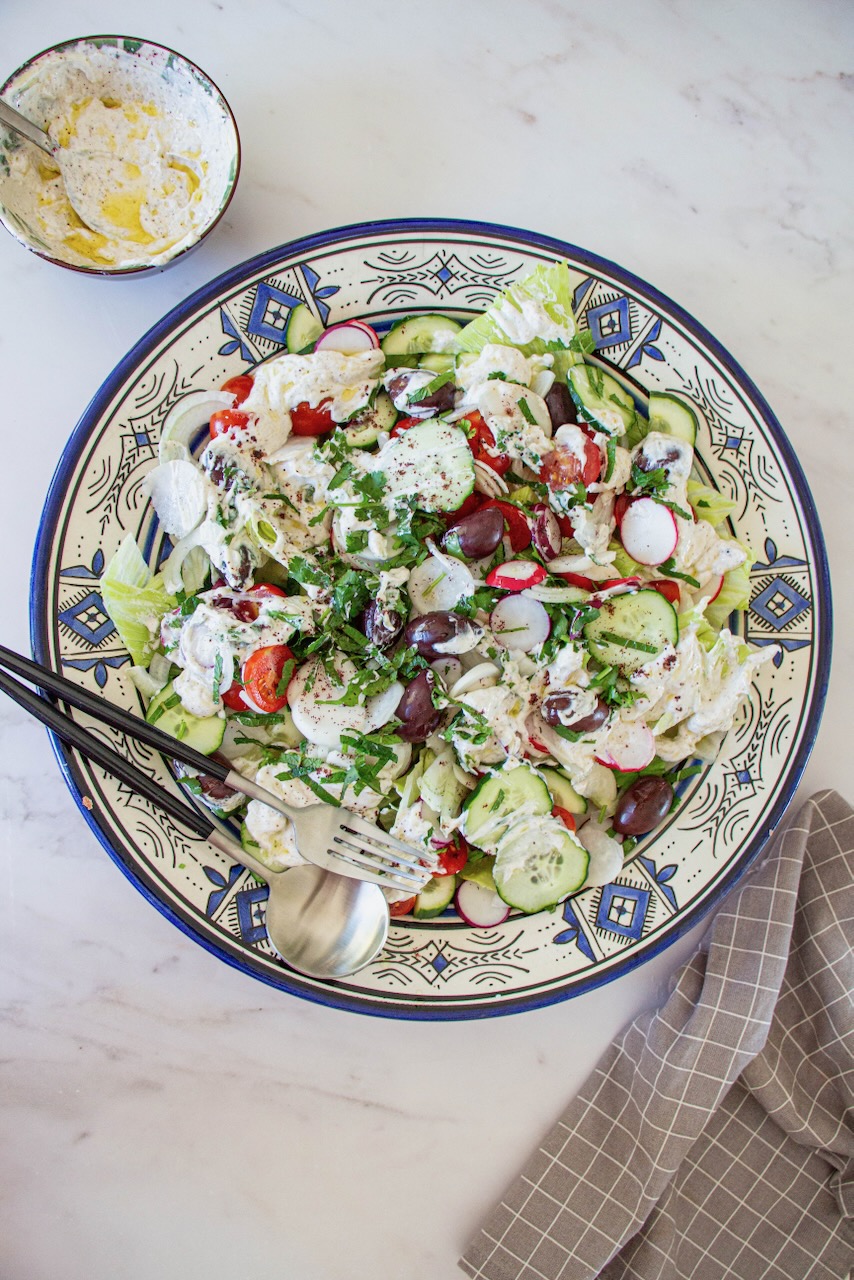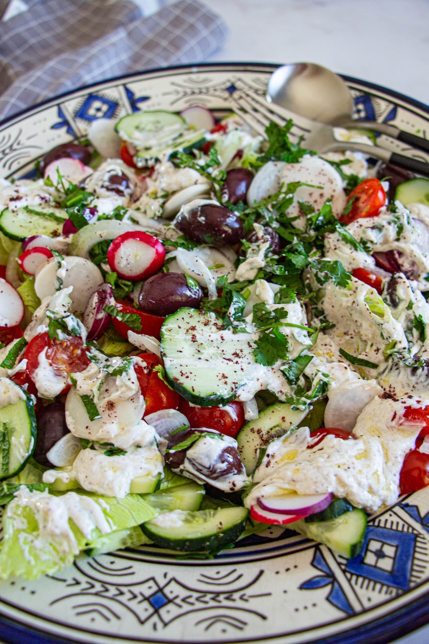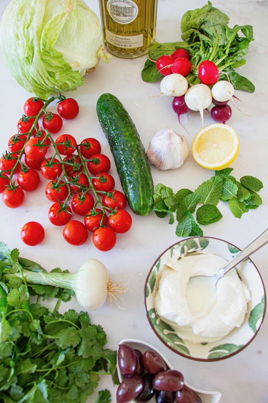 Add the cucumber, radishes, olives, tomatoes, Iceberg lettuce, and chopped spring onions to your liking.