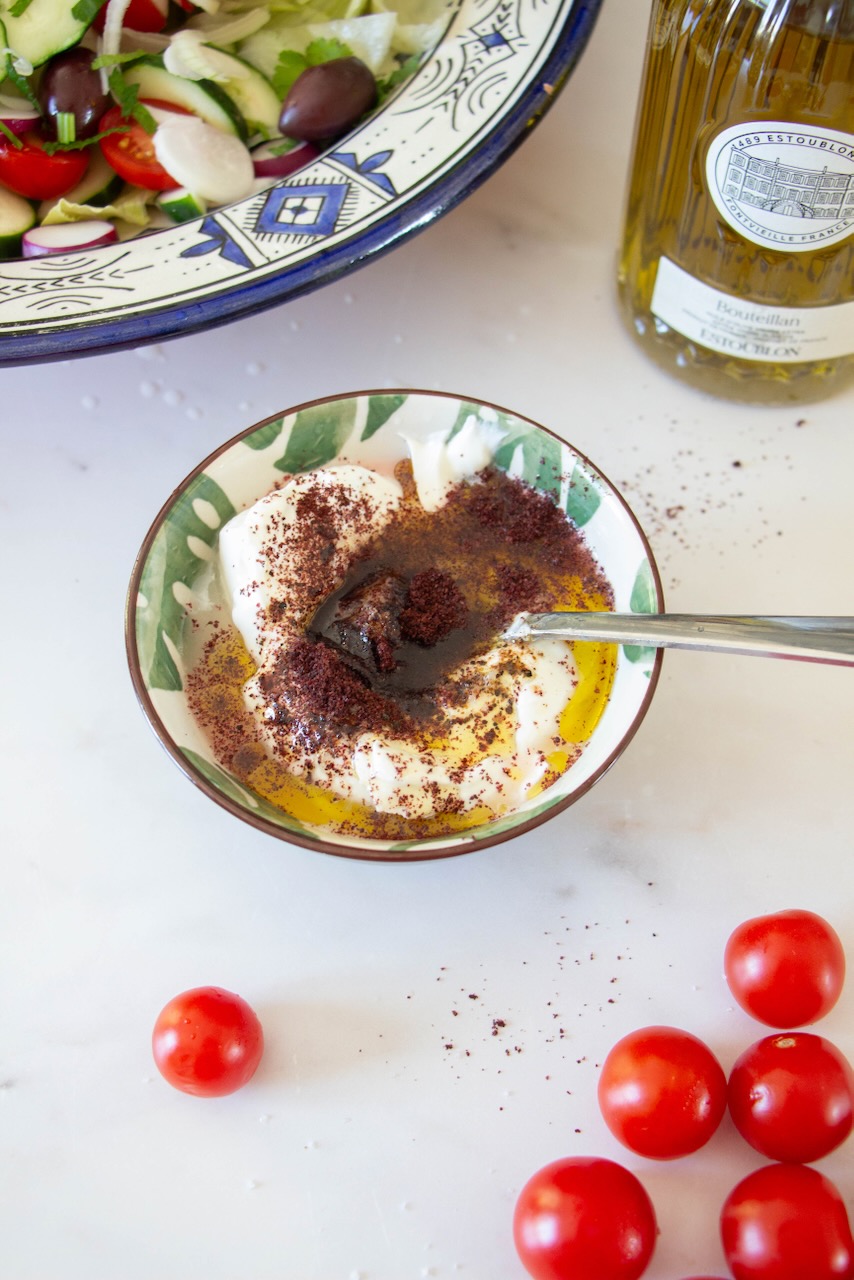 Mix in a small bowl the juice of the lemon, the grated garlic clove, the pepper, the fleur de sel, the sumac, and the olive oil.
