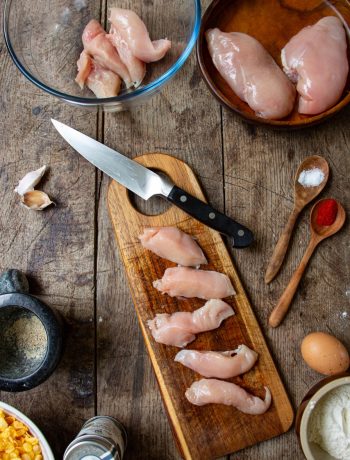 You only need 4 ingredients to make this recipe: chicken fillets (obviously!), flour, eggs, and unsweetened cornflakes. Nothing complicated! You can also use breadcrumbs if you don’t have cornflakes. My opinion: cornflakes give a crunchier texture than breadcrumbs. I love it!