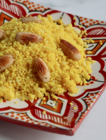 As a side dish, couscous is the obvious choice. Here, I added turmeric to it for a bit more flavor and a lovely yellow hue.