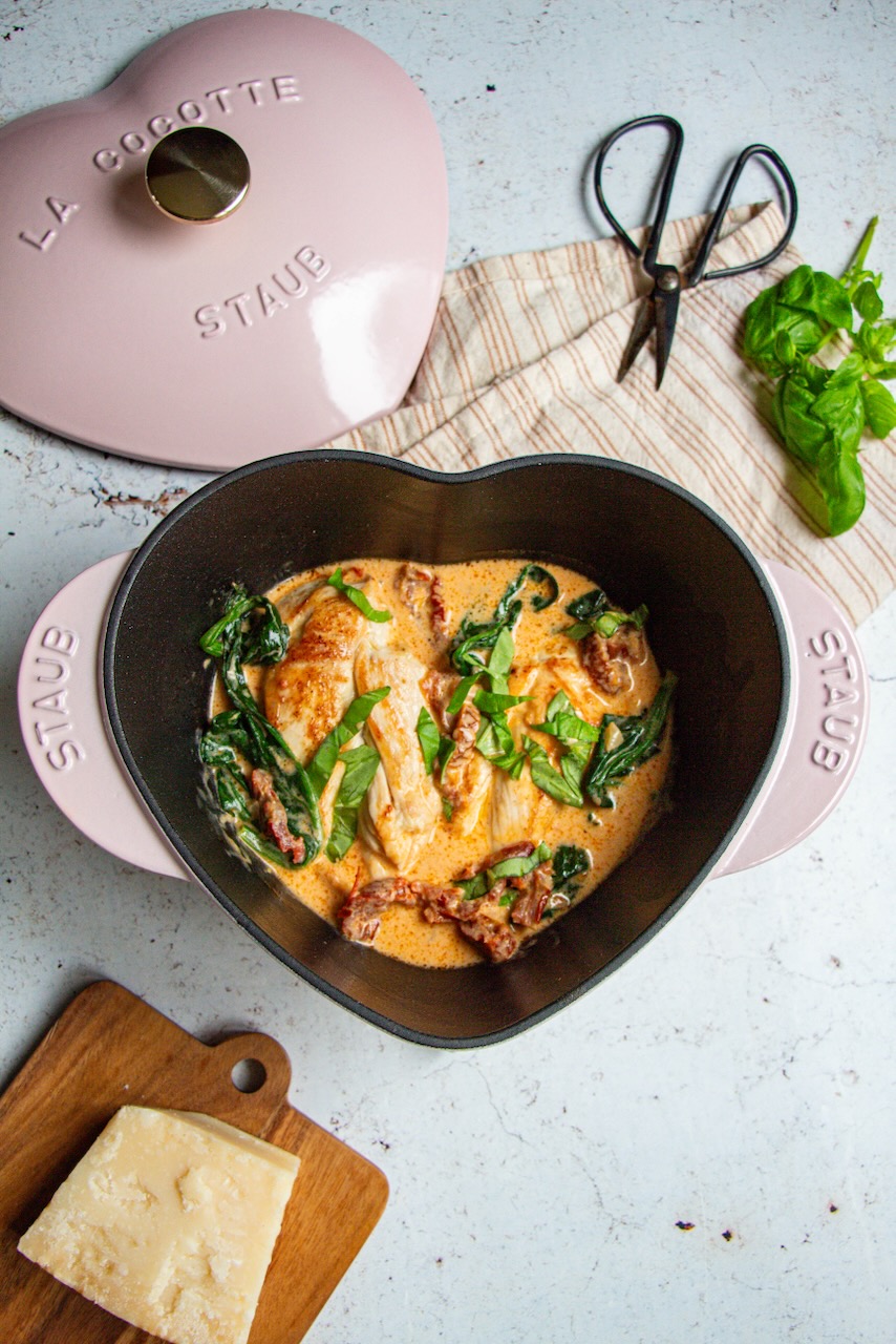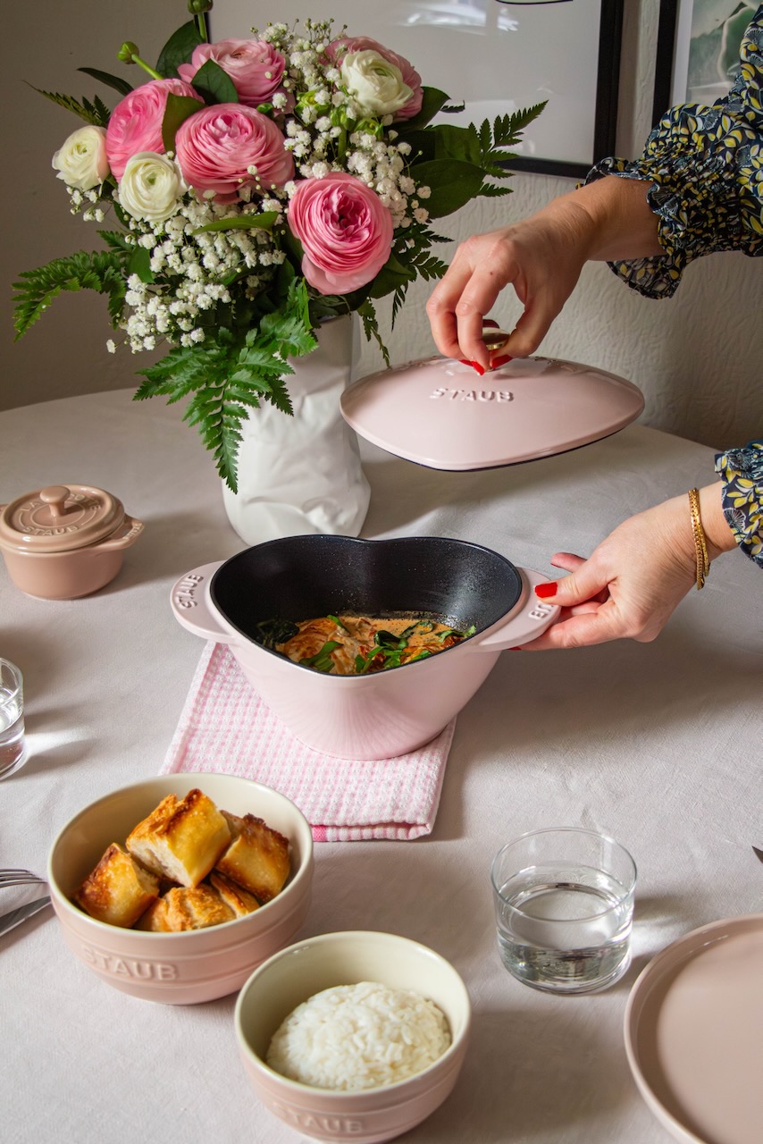 I wanted to share this recipe also because I had the perfect pot for it! The pink heart cocotte (also available in red) from Staub. It’s perfect for a dish for two and takes up little space in the cupboard. I think it’s a great choice to have a high-quality product, made in France, that is neither too heavy nor too bulky!
