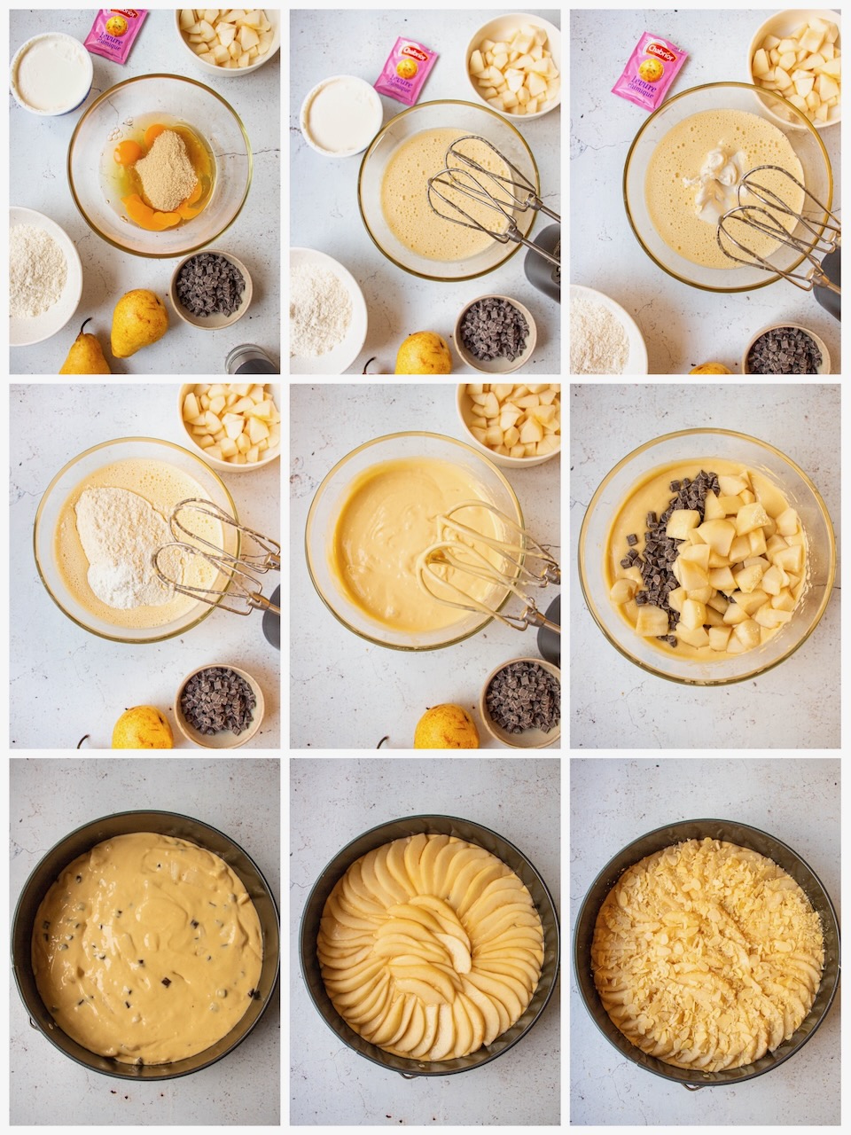 Pour the pear cubes and chocolate chips into the mixture, pour everything into your previously buttered mold.