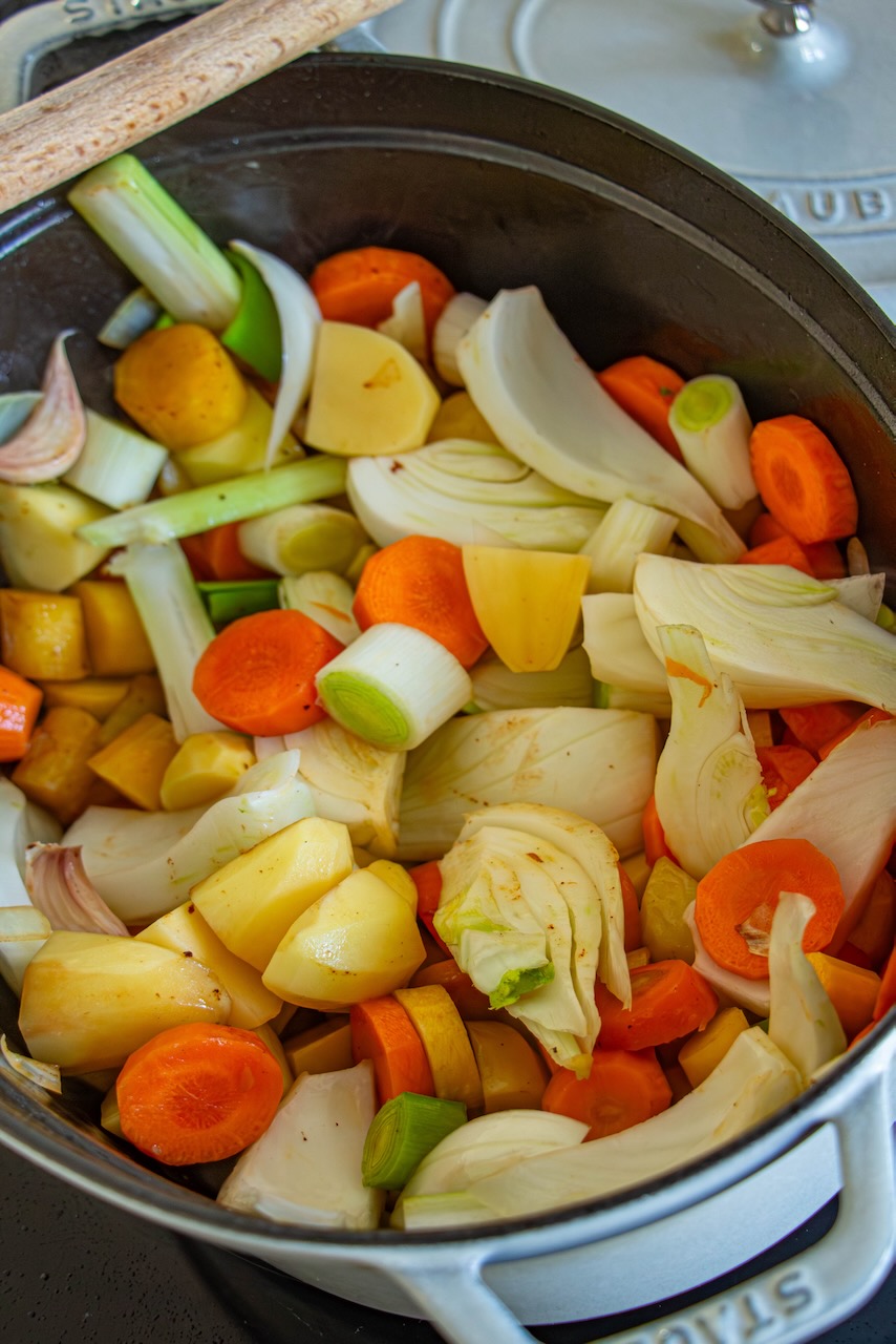 Then add the carrots, potatoes, leek, and fennel, peeled and cut into pieces. Cook for 3 minutes.