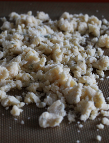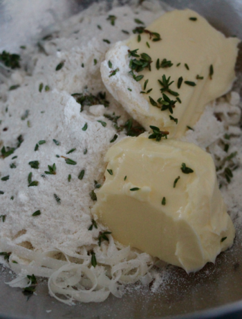 Make a crumble with the parmiggiano cheese, the flour, the soft butter and the thyme leaves.
