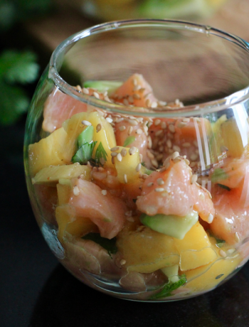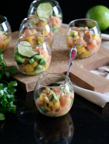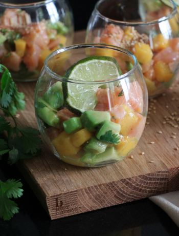 So today, these salmon, avocado, and mango tartare verrines are pure joy!! As an appetizer or starter, it’s perfect. 15 minutes of prep time tops, color, flavor, freshness, and all that without guilt. Apart from the fat in the salmon, we’re talking light ingredients here. The lemons bring the right amount of acidity, the avocado and mango bring sweetness, and the coriander brings the zing!!