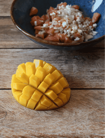 Place the salmon, mango, and avocado cubes in a bowl, then add the finely chopped coriander.