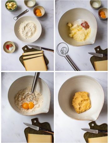 Mix the softened butter with the flour, grated Beaufort, baking powder, salt, nutmeg, and paprika until you get a smooth, even mixture.