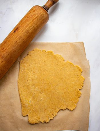Roll out the dough between two sheets of parchment paper to a thickness of 0.5 cm.