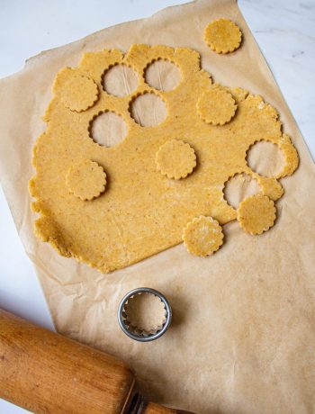 Using a cookie cutter, cut out 4 cm diameter circles to get about 40 to 50 pieces. If the dough becomes harder to work with as it warms up, place it back in the fridge for a few minutes.