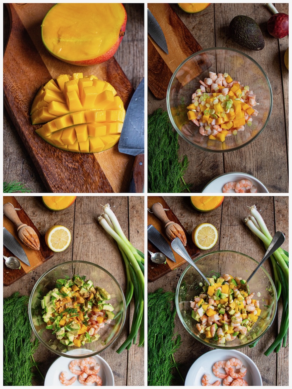 Cut the shrimp, avocado, and mango into cubes. Put everything in a bowl.