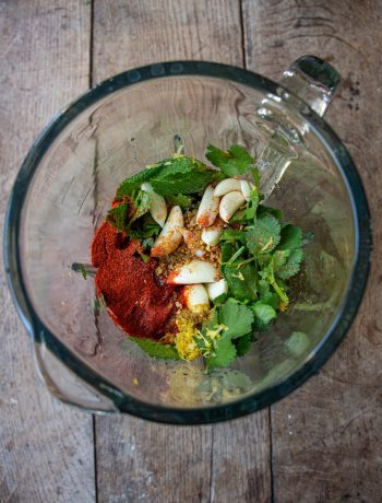 In your blender, blend the lemon zest and juice, the herbs, garlic, paprika, lightly crushed fenugreek seeds, cumin, olive oil, 1.5 teaspoons of salt, and 1/2 teaspoon of pepper until you get a paste.