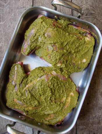 Place the lamb shoulder in your dish and make small incisions with a sharp knife. Pour the marinade over the lamb shoulder and spread it well, making sure it seeps into the cuts. Cover with plastic wrap and refrigerate for at least 4 hours (I did it overnight).