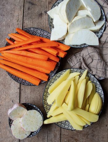 Meanwhile, peel and cut the half celeriac into 6 wedges. Peel and cut the carrots into four pieces each, across the width. Do the same with the potatoes.