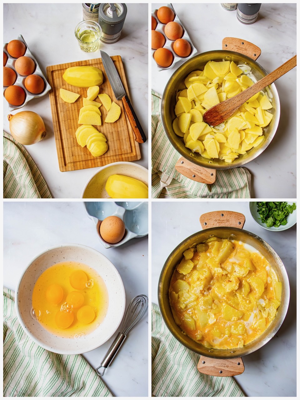 Beat the eggs in a small bowl, salt, pepper, then pour over the potatoes.