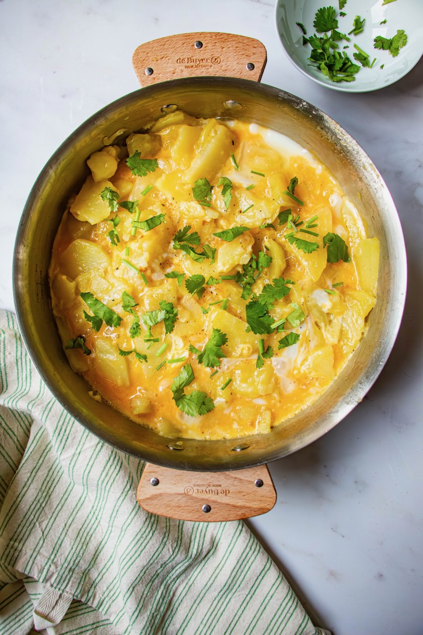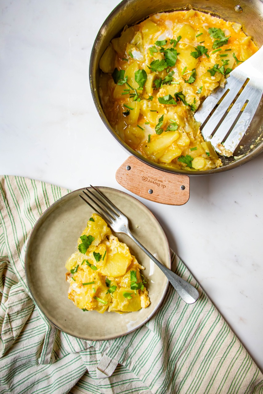 The Spanish tortilla is beloved for its perfect balance of ingredients. The eggs contribute softness and creaminess, while the potatoes provide a melting, satisfying texture. Depending on regional and family traditions, onion sometimes adds a slightly sweet note to the dish. That’s my choice here.