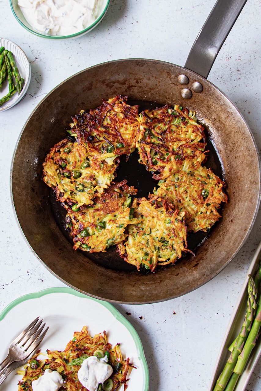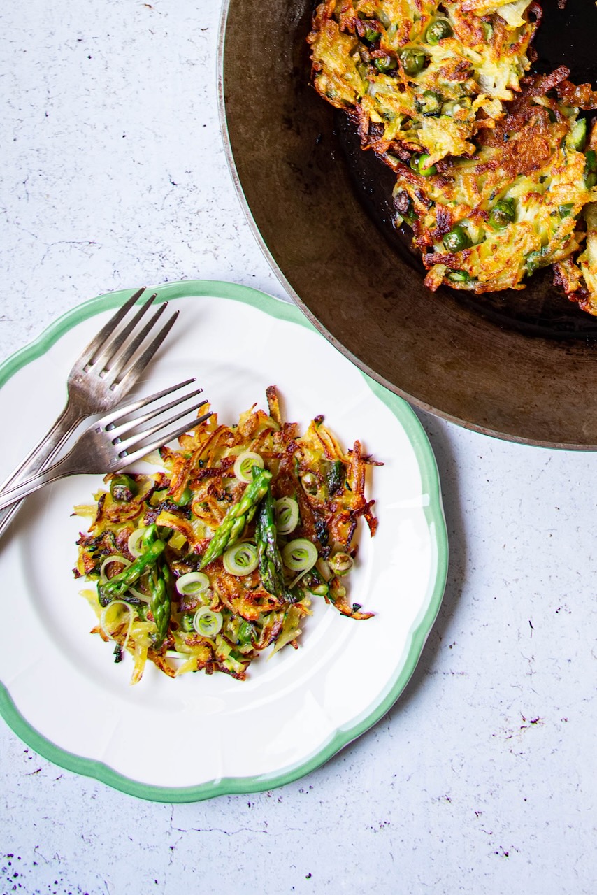 Indeed, this spring vegetable rösti recipe may remind you of one or another dish already featured here. And that’s perfectly normal; let me explain… You might be thinking of the Alsatian potato pancakes, or grumbeerekiechele, or perhaps my zucchini and potato cakes. We could even mention my corn cakes…