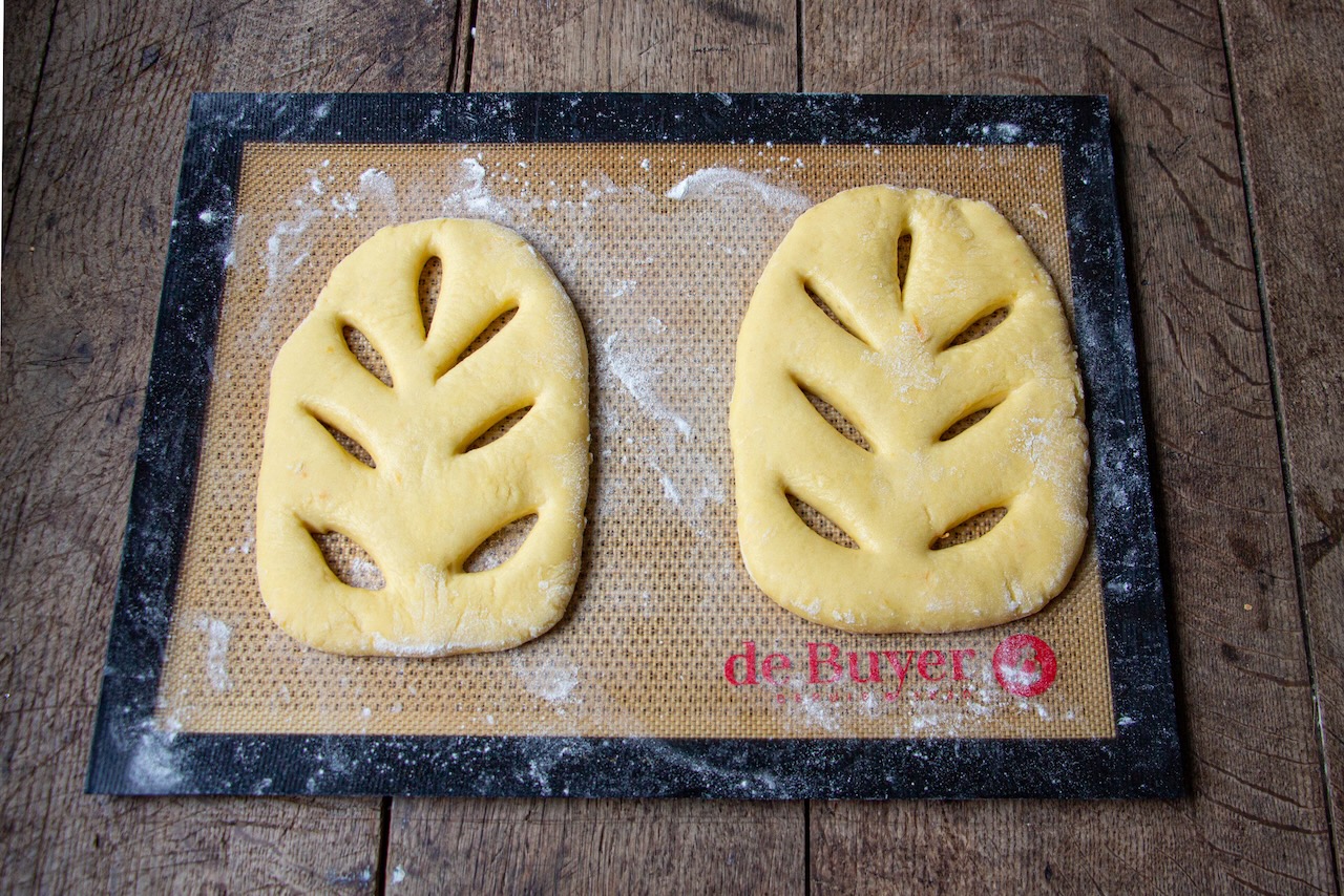 Place your 6 fougasses on 3 baking trays.