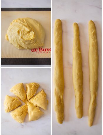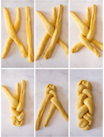 Start braiding from the center of the ropes. Then turn your brioche around and finish the braid. (see the step-by-step photos below)