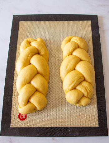 Cover each braid with plastic wrap and let rise for 2 to 3 hours in a warm, humid place.